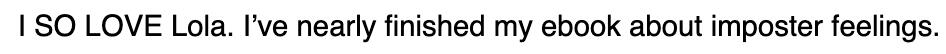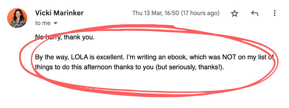 Now Lola's got your back where lead gen is concerned...you're going to need a series of welcome emails to send those juicy new leads.If you'd rather clean your toilet than sit down to write copy, I have a solution.Mimi is Lola's big sister. She's an email copy coach and she's built using the proven frameworks I teach to my group students and in my 1:1 work.After having a chat with you, she can write welcome emails, sales emails and you're regular newsletters!And she costs just £47. Copywriters are 'spenny...Mimi is purse-friendly because everyone deserves to write emails that nurture and convert leads into raving fans.Click the big yellow button below to learn more.